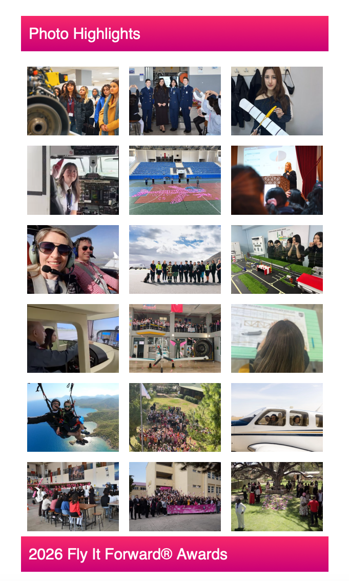 Bei der internationalen Aktion "Fly It Forward" werden weltweit Mädchen und Frauen von Piloten zu Flügen eingeladen, um sie für die Luftfahrt zu begeistern. Bisher wurden in diesem Rahmen in 18500 Flugstunden fast 100000 Mädchen und Frauen in die Luft gebracht.